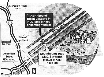 On the local news which I and two judges had seen just before meeting, the lead story was about mourners placing flowers at the entrances to the HOV (High Occupancy Vehicle) lane of Interstate 279. The HOV lane, which runs down the center of the busy, many-laned interstate, had been the site of a terrible head-on collision the previous Friday, August 25. Traffic is supposed to run in only one direction on the two-lane road-- inbound in the mornings, and outbound in the afternoons -- but shortly after noon that day, a fatal error was made and six people were killed. One of them was a teenage boy who was survived by six brothers.